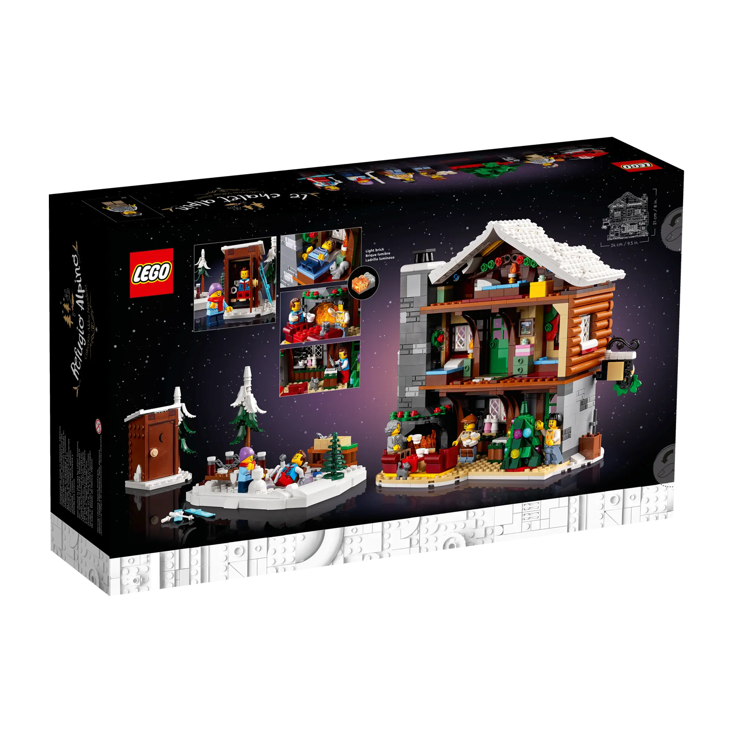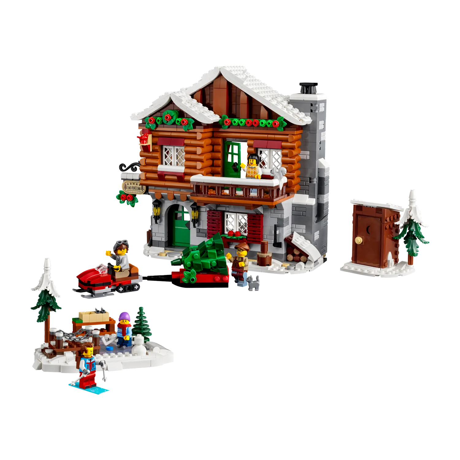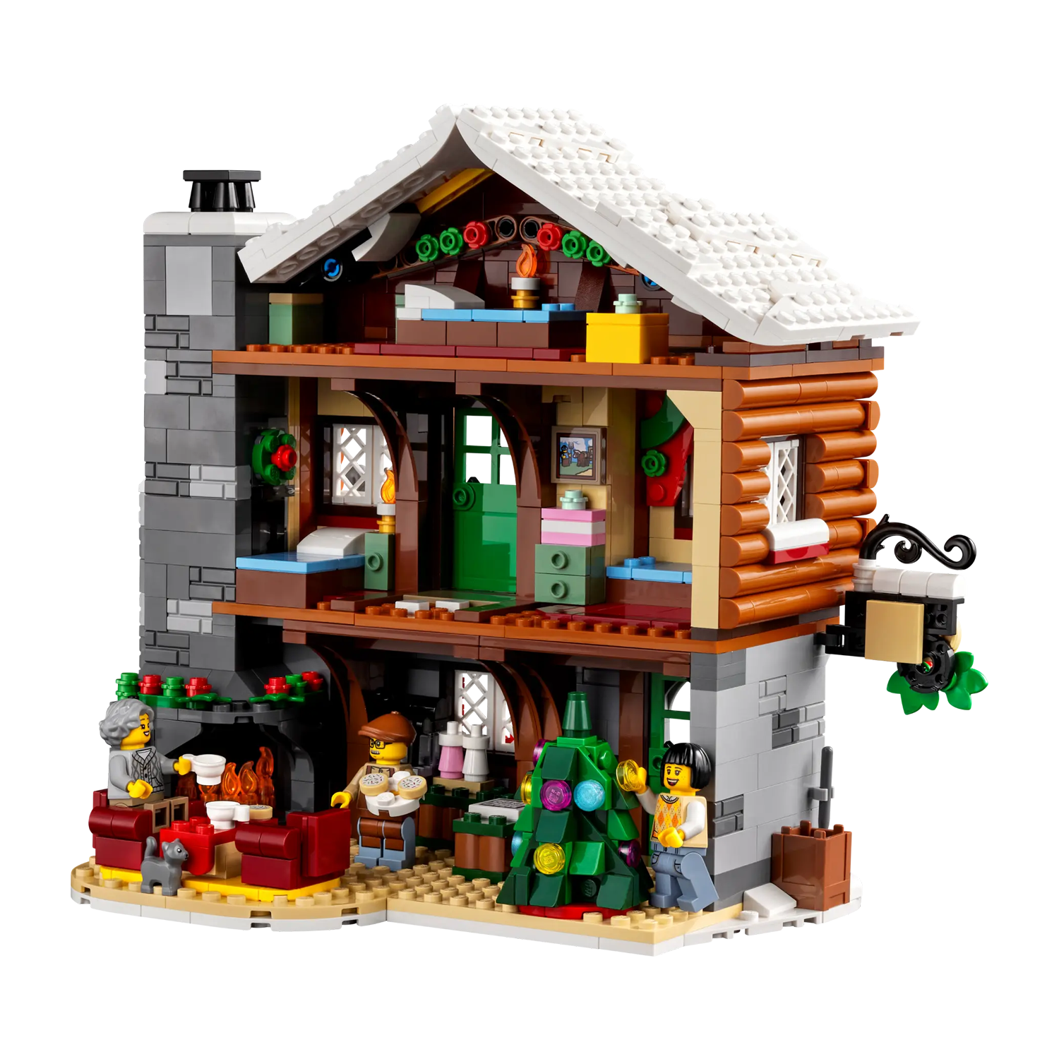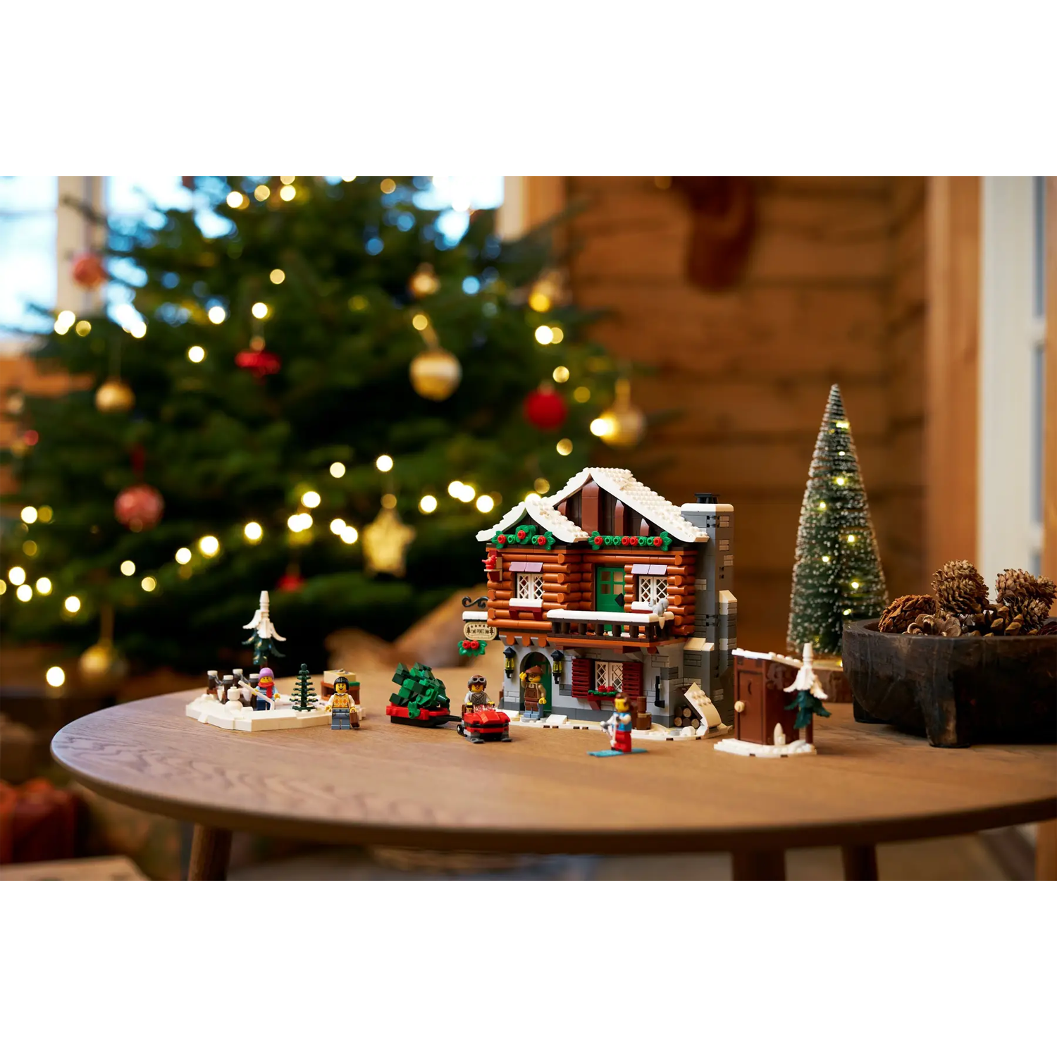 Het model van 3 verdiepingen heeft een gemeubileerde ontvangstruimte met een incheckbalie, een opgloeiende haard en een koffiezetapparaat, nog een opgloeiende haard in de gastenkamer met 2 bedden op de eerste verdieping en haard en een slaapkamer op de knusse zolder. Buiten vind je onder meer een houtopslag, een skibox, een schaatsbaan en een toiletcabine, plus een sneeuwscooter, een kerstboom, 5 minifiguren en figuren van een vogel, een kat en een eekhoorn.