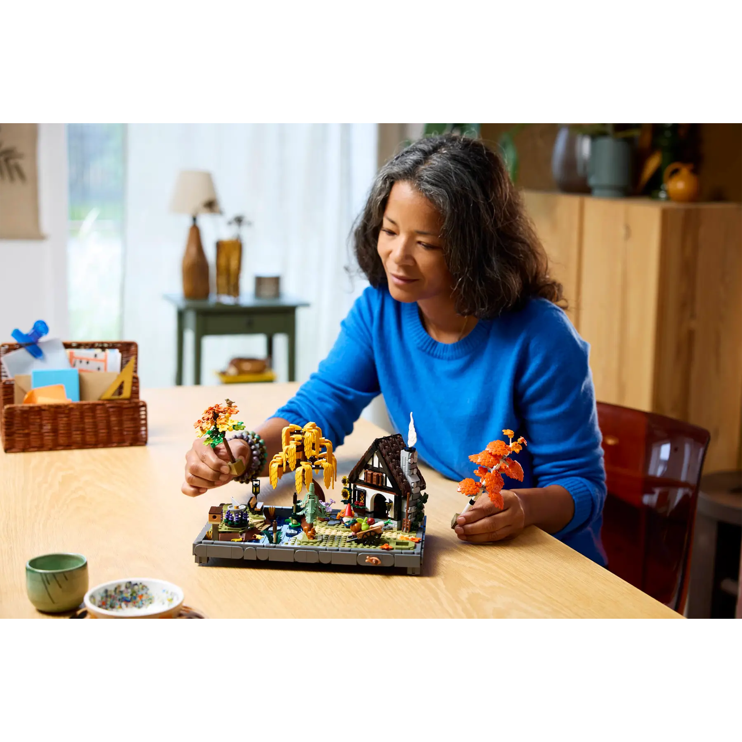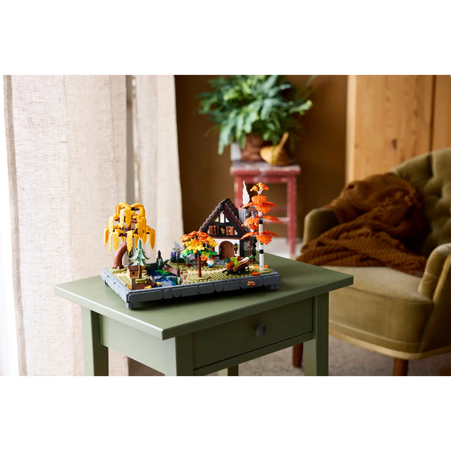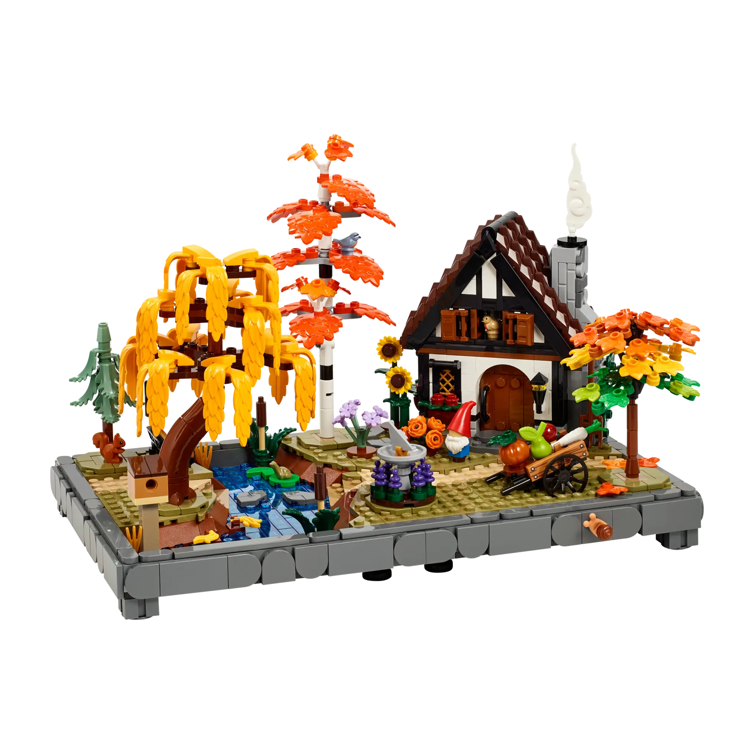 Deze set uit de collectie Tuinen van de wereld is geïnspireerd op sprookjeshuizen en bevat een berk, treurwilg, blauwspar en esdoorn, plus herfstachtige bloemen. Andere details zijn een zonnewijzer, een vogelhuisje, een groentekarretje, een tuinkabouter en een beekje met stenen. Een cottage met een knusse keuken en bosdieren, waaronder een roodborstje en boomklever, een eekhoorn, een kikker en een slak maken het model helemaal af. Een prachtig cadeau voor volwassen fans van creatieve woondecoratie!