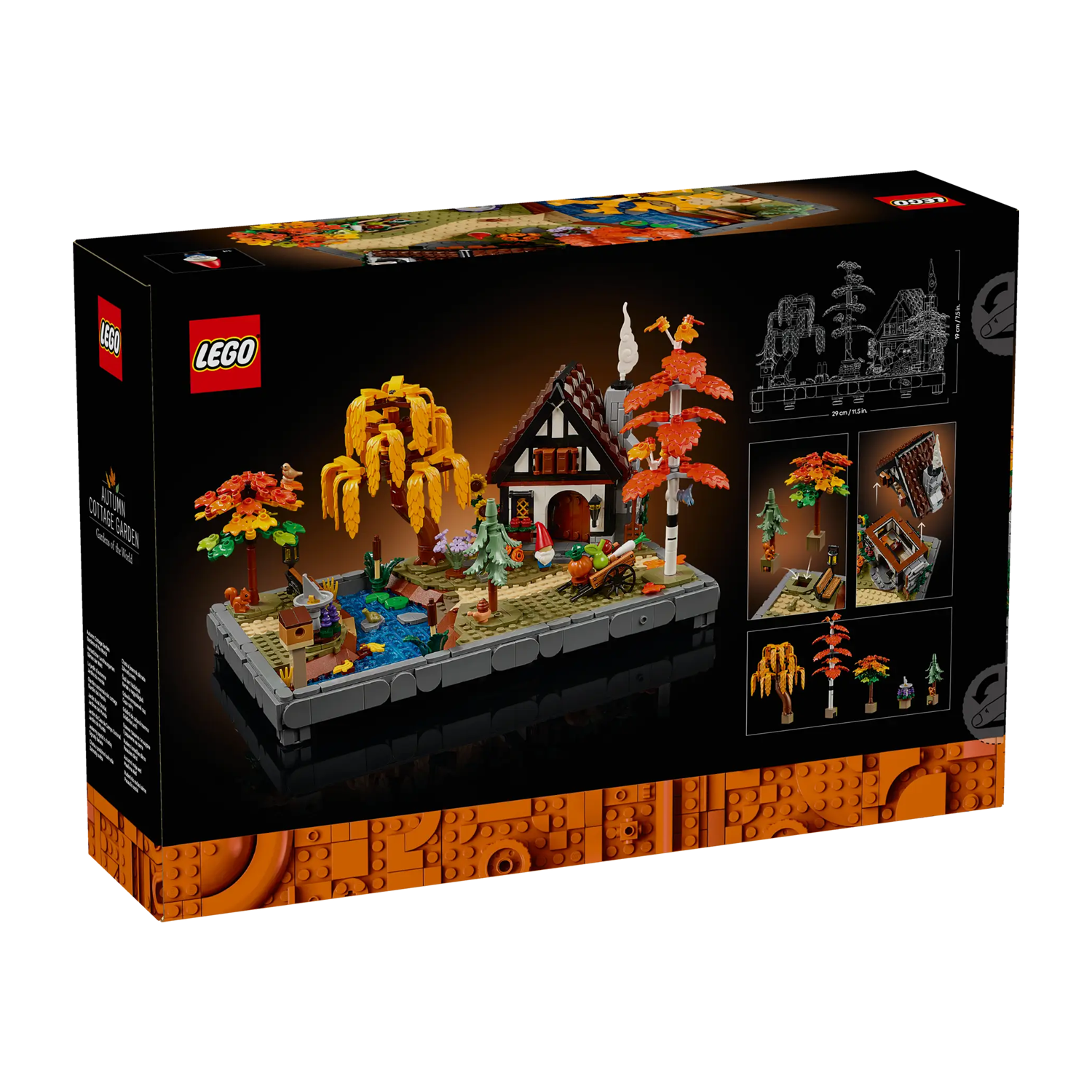 - AFMETINGEN – het model in deze 1102-delige LEGO® Icons Herfsttuin met cottage set is ca. 19 cm hoog, 29 cm breed en 18 cm diep