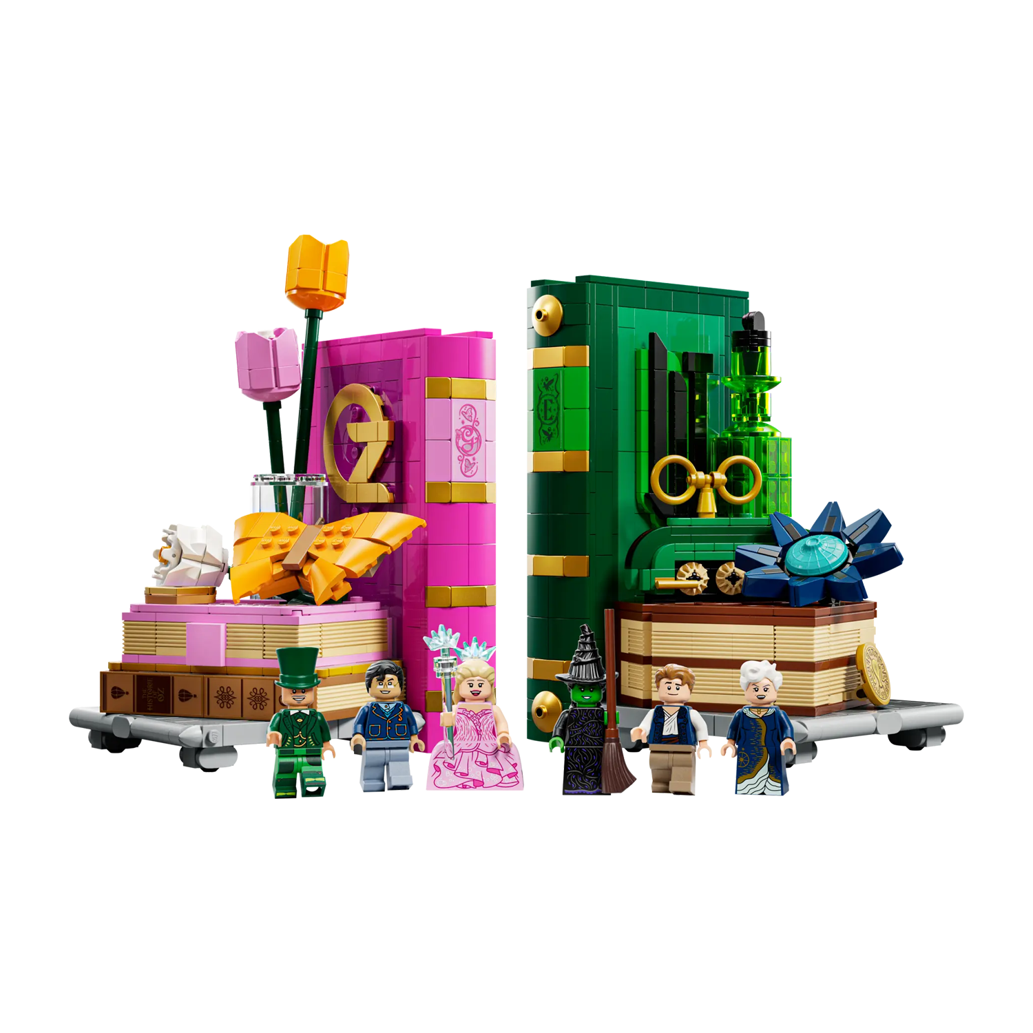 Elphaba's groene boekensteun bevat haar groene elixer, een model van Emerald City en een Grimmerie met geheime vakjes voor de minifiguren van The Wizard en Fiyero. In Glinda's roze LEGO boekensteun staat een model van Shiz University. Een vlinder zit boven op een stapel boeken met een vak voor de minifiguren van Madame Morrible en Pfannee.
