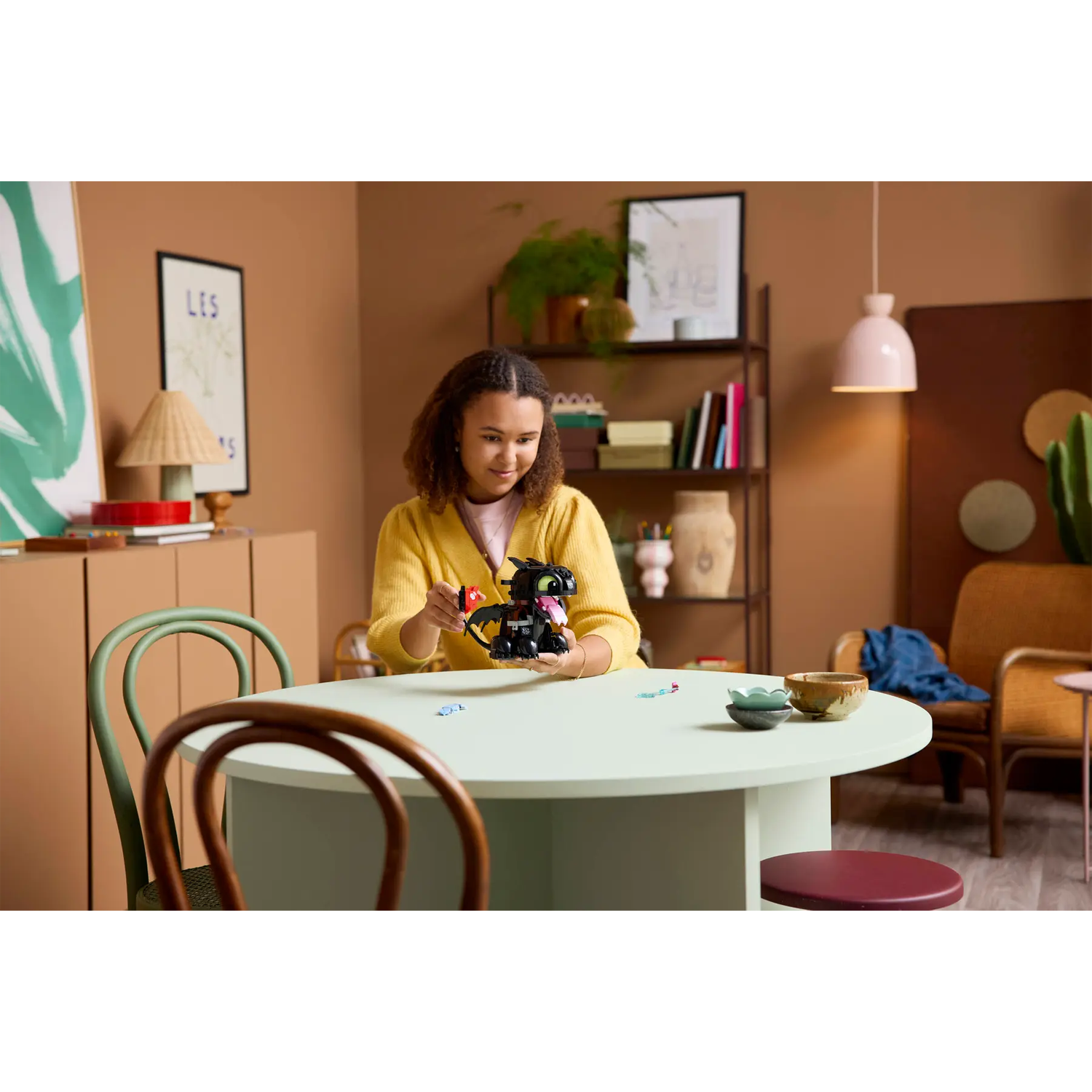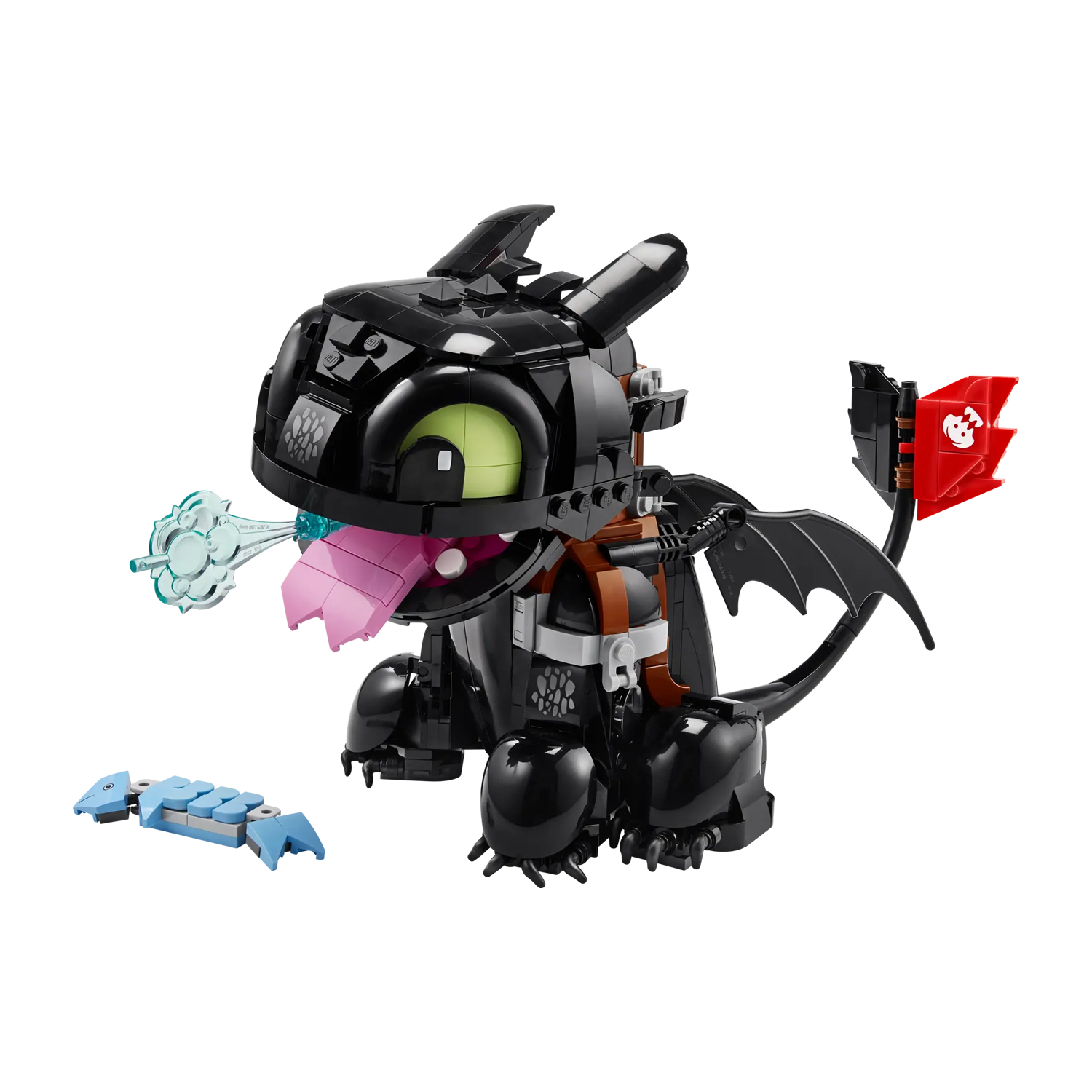 - Wat zit er in de doos? – alles wat je nodig hebt om een LEGO® Icons Hoe tem je een draak: Tandloos figuur met verstelbare gewrichten te bouwen, plus een vis en plasmastraal om te bevestigen