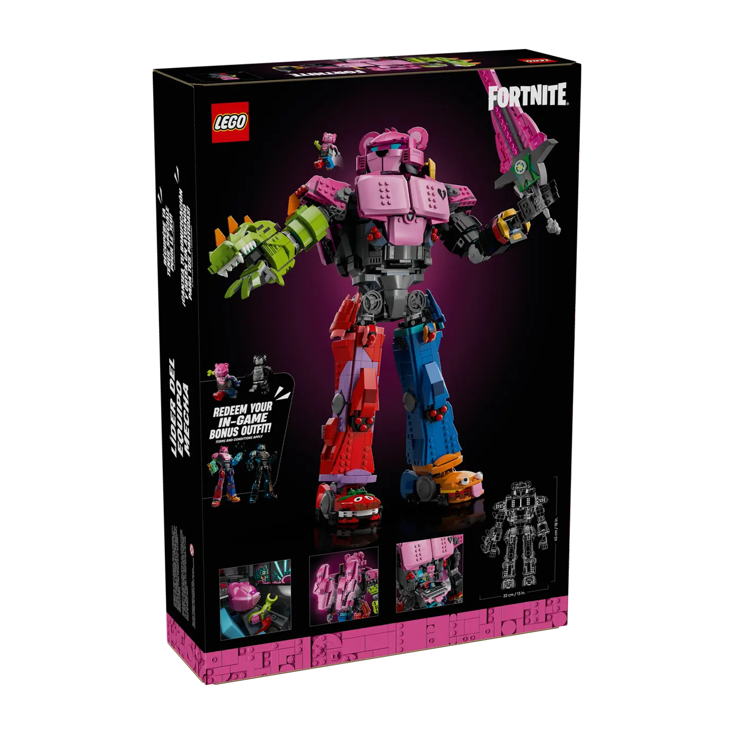 Deze figuur is een leuk cadeau voor gamers en LEGO Fortnite fans en zal zeker indruk maken op gasten. Bovendien bevat de set digitale bonusitems: Mecha Team Leader en Mecha Team Shadow outfits, die je kunt inwisselen in de LEGO Fortnite en Fortnite games, zodat je er lang na het bouwen nog plezier van hebt. De set bevat 2503 onderdelen.