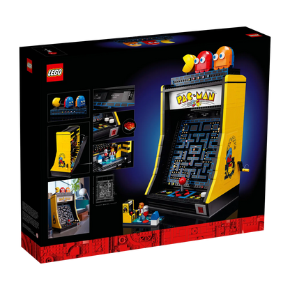 - Wat zit er in de doos? – alles wat je nodig hebt om de PAC-MAN speelkast en een displaydoos met draaibare figuren van PAC-MAN, BLINKY en CLYDE te bouwen, plus een scène uit de jaren 80 met een minifiguur van een gamer