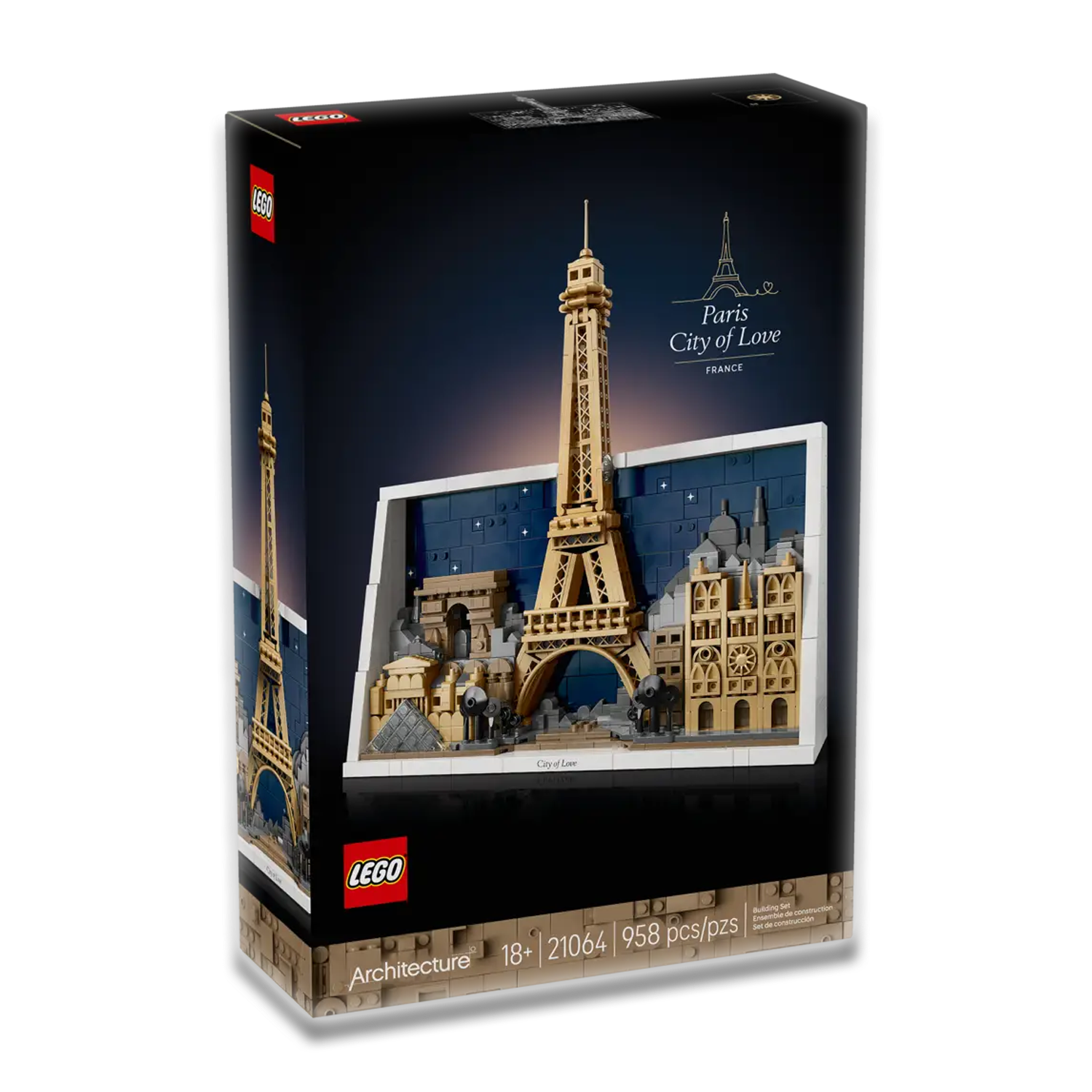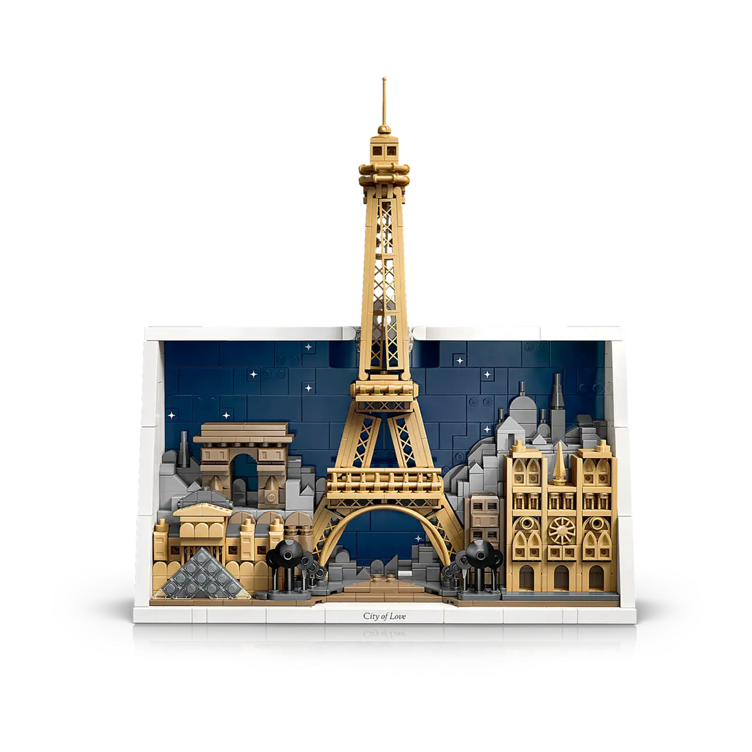 - ONTDEK DE HOOGTEPUNTEN VAN PARIJS – deze gedetailleerde LEGO® Parijs – Stad van de Liefde (21064) set bevat 4 architectonische bezienswaardigheden uit Parijs tegen een stadsgezicht en een sterrenhemel die zijn omlijst met witte stenen