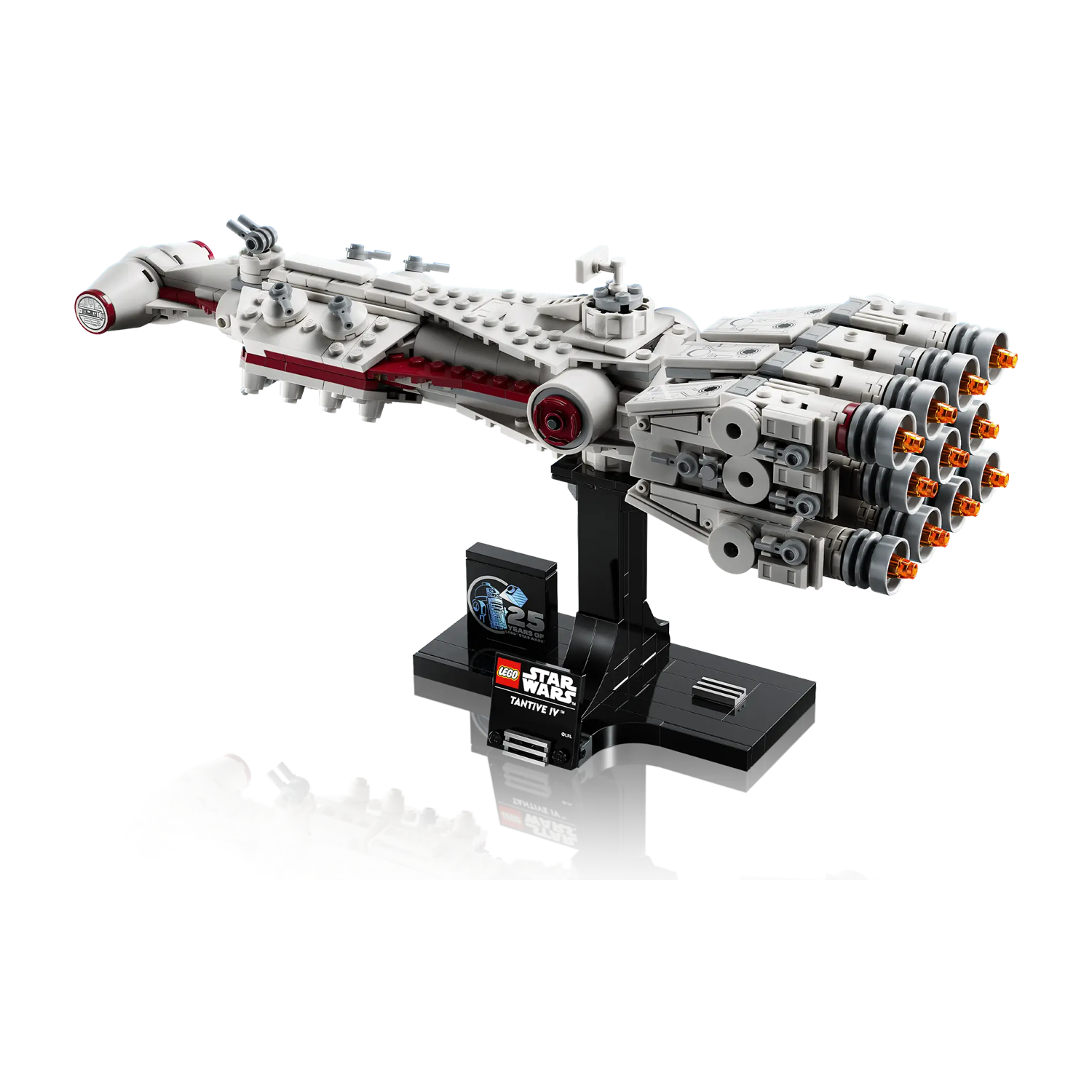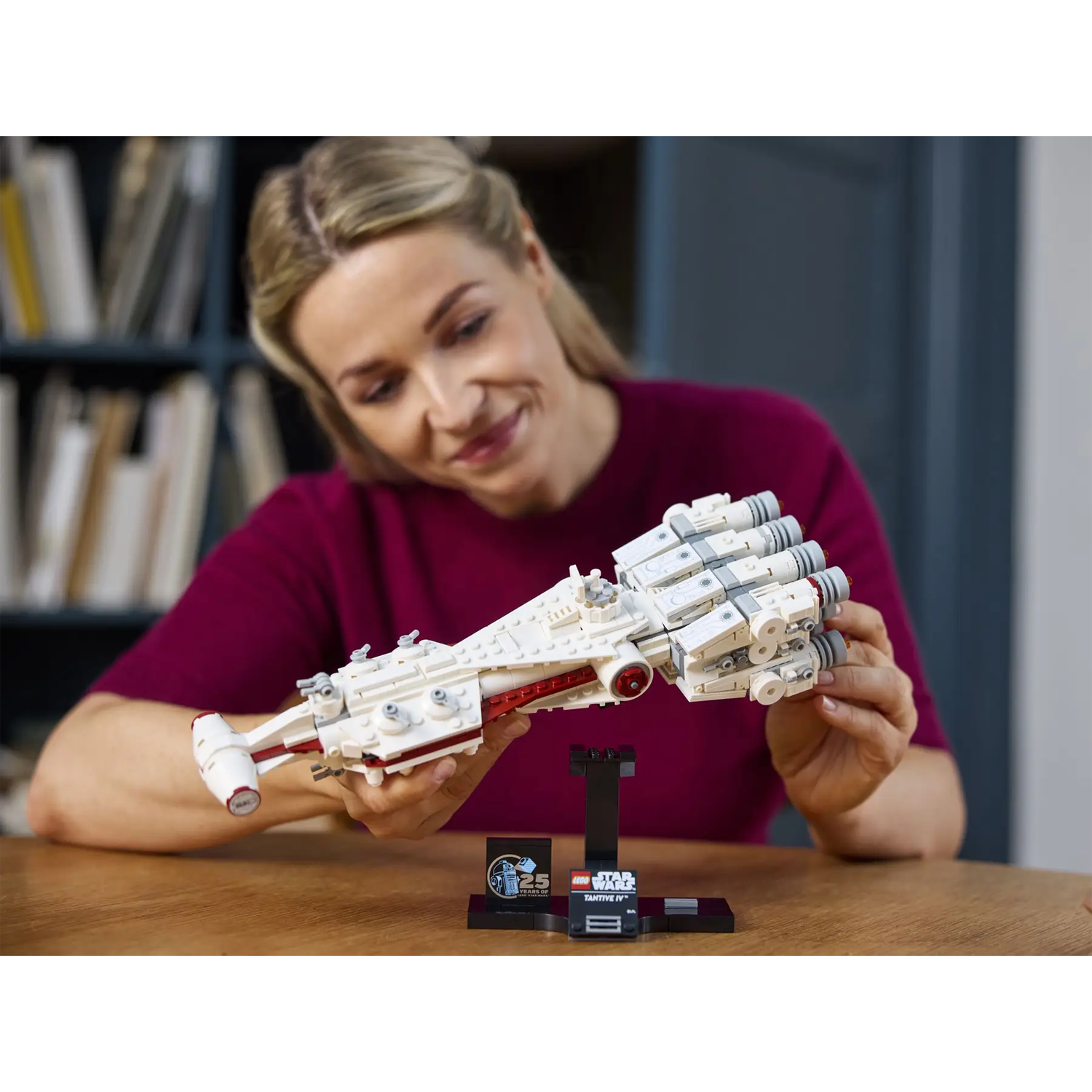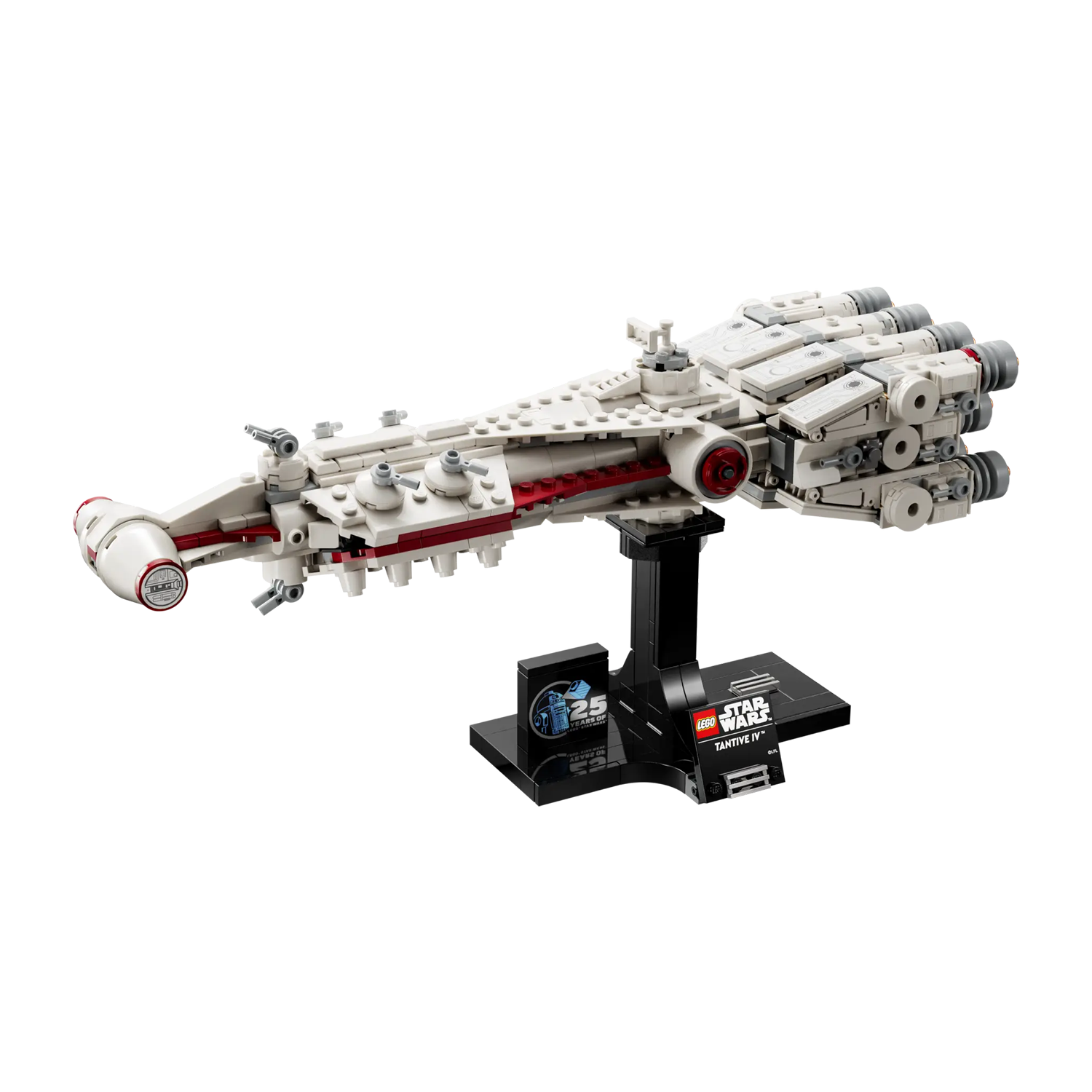 - Gemaakt om neer te zetten – de bouwbare standaard heeft een naamplaatje en een jubileumsteen ter ere van 25 jaar LEGO® Star Wars™ en is ontworpen voor de Tantive IV