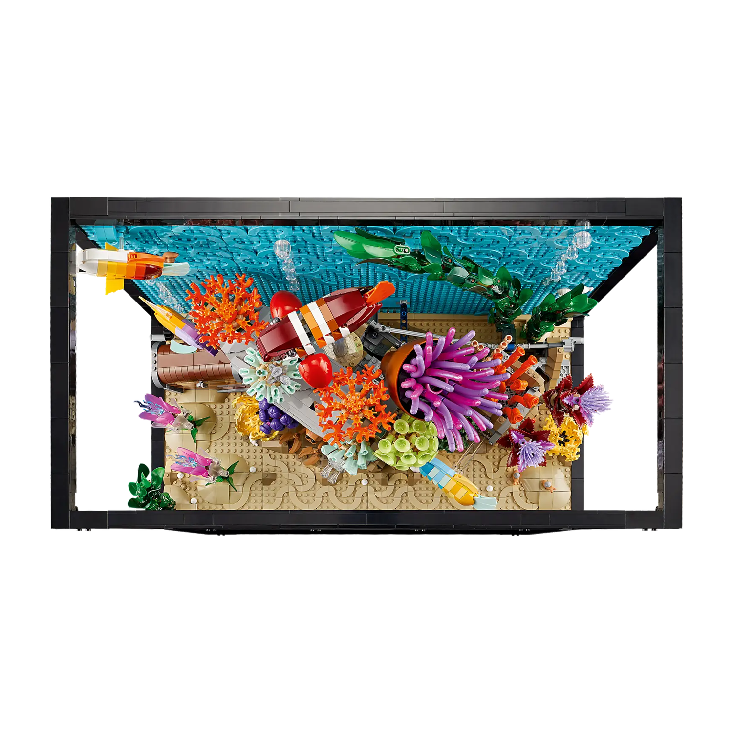 Dit decoratieve aquarium heeft veel leuke functies. Draai aan de knoppen en hendels om een zwemmende vis, wuivend koraal, een krab die uit een onderwatergrot tevoorschijn komt en een openende schatkist te laten bewegen. Het aquarium wordt geleverd met 4 vissenfiguren en verschillende soorten planten en koraal, zeewormen, een oesterschelp met een parel, LEGO zeeslakken en luchtbellen.